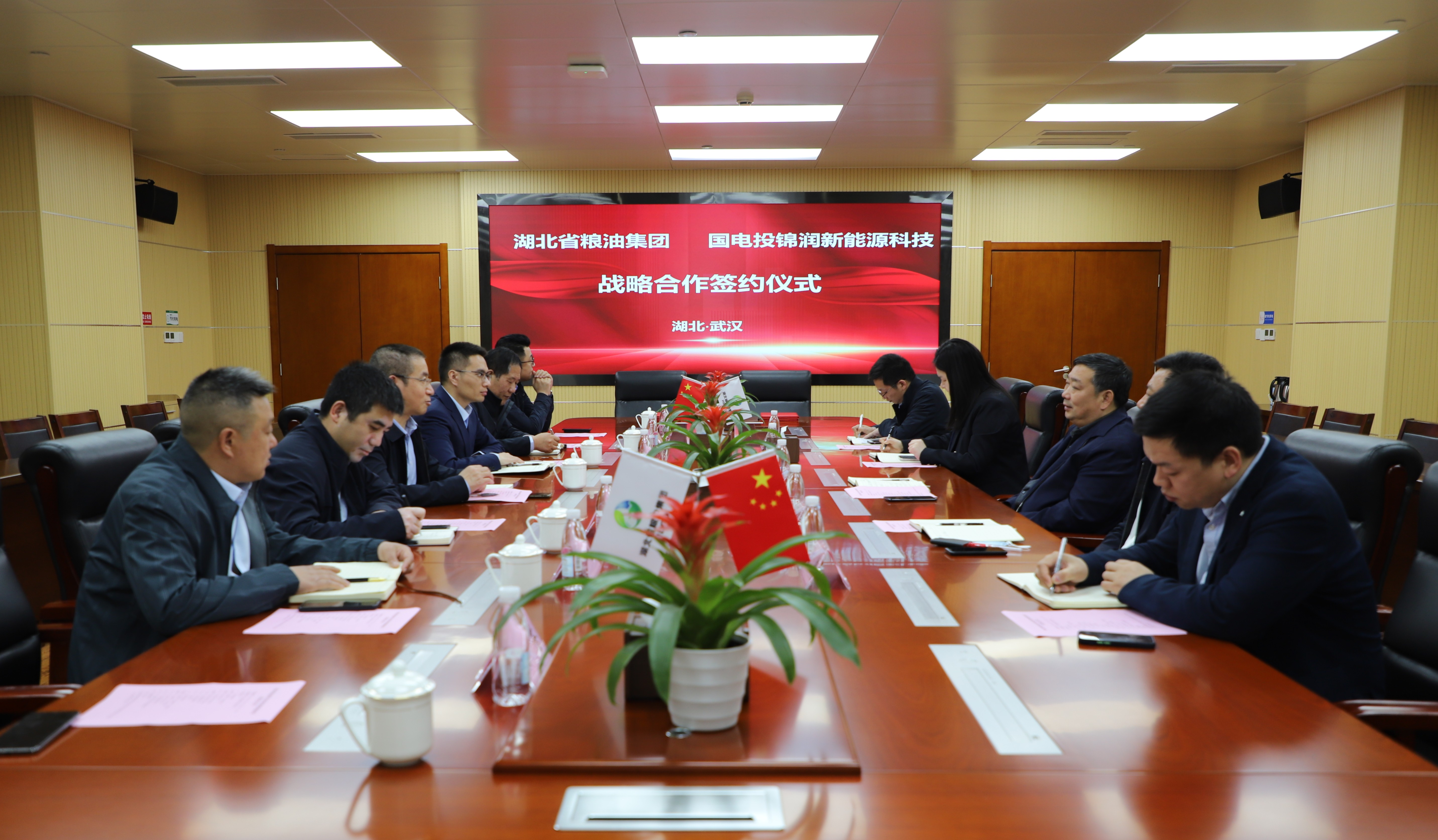 3月27日,湖北省糧油集團(tuán)黨委書(shū)記、董事長(zhǎng)紀(jì)道斌會(huì)見(jiàn)國(guó)電投錦潤(rùn)新能源科技董事長(zhǎng)、黨支部書(shū)記張學(xué)榮一行,雙方就深化“綠色儲(chǔ)糧”領(lǐng)域合作達(dá)成共識(shí)并現(xiàn)場(chǎng)簽署戰(zhàn)略合作協(xié)議。集團(tuán)黨委委員、副總經(jīng)理董成華參加座談。