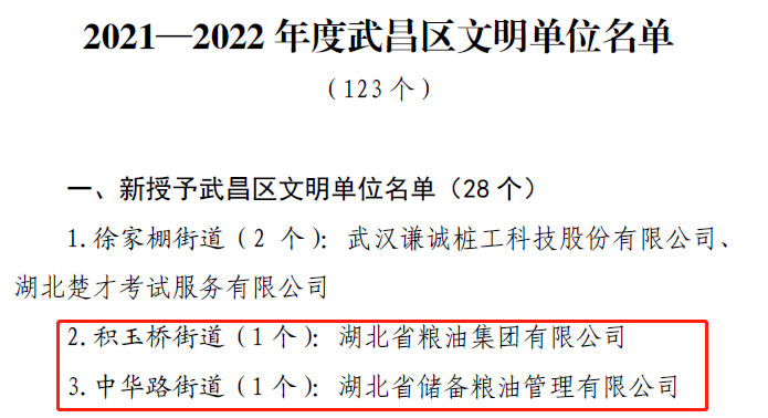 踐行社會主義核心價值體系,以實(shí)際行動賦能糧食安全、服務(wù)百姓餐桌,展現(xiàn)鄂糧擔(dān)當(dāng)……近日,中共武昌區(qū)委、武昌區(qū)人民政府下發(fā)《關(guān)于表彰2021-2022年度武昌區(qū)文明街道、文明社區(qū)、文明單位、文明單位(校園)的通報》,湖北省糧油集團(tuán)有限公司及兄弟公司湖北省儲備糧油管理有限公司被授予2021-2022年度“武昌區(qū)文明單位”稱號。