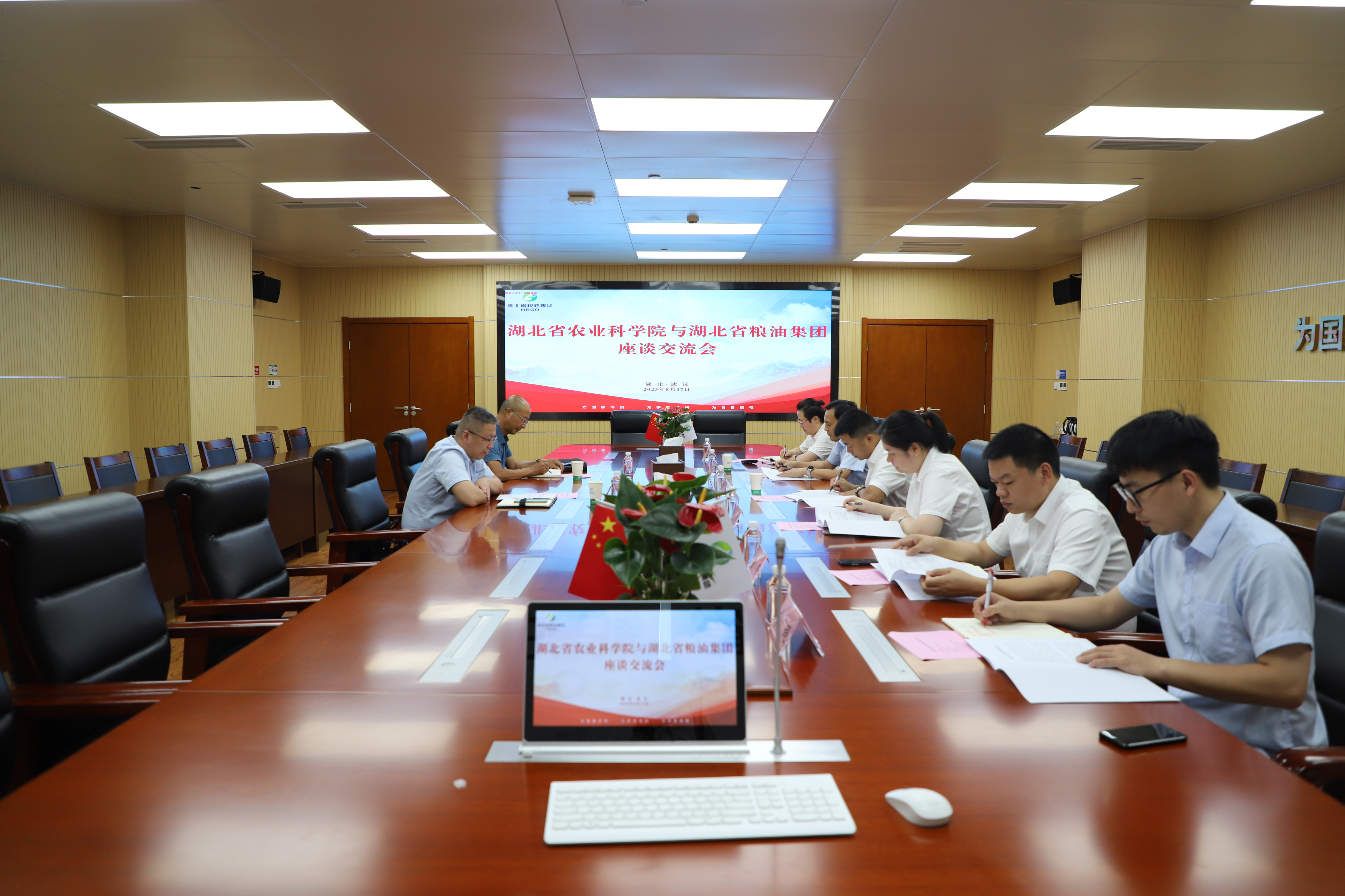 8月17日,湖北省糧油集團(tuán)黨委委員、副總經(jīng)理王林奎會(huì)見湖北省農(nóng)業(yè)科學(xué)院科技處副處長(zhǎng)周榮華一行,雙方就就持續(xù)加強(qiáng)農(nóng)業(yè)領(lǐng)域合作,促進(jìn)技術(shù)開發(fā)與成果轉(zhuǎn)化等方面進(jìn)行座談交流。湖北省農(nóng)業(yè)科學(xué)院研究員萬(wàn)丙良、湖北省糧油集團(tuán)綜合辦公室、經(jīng)營(yíng)管理部、產(chǎn)業(yè)辦公室主要負(fù)責(zé)人參加坐談。