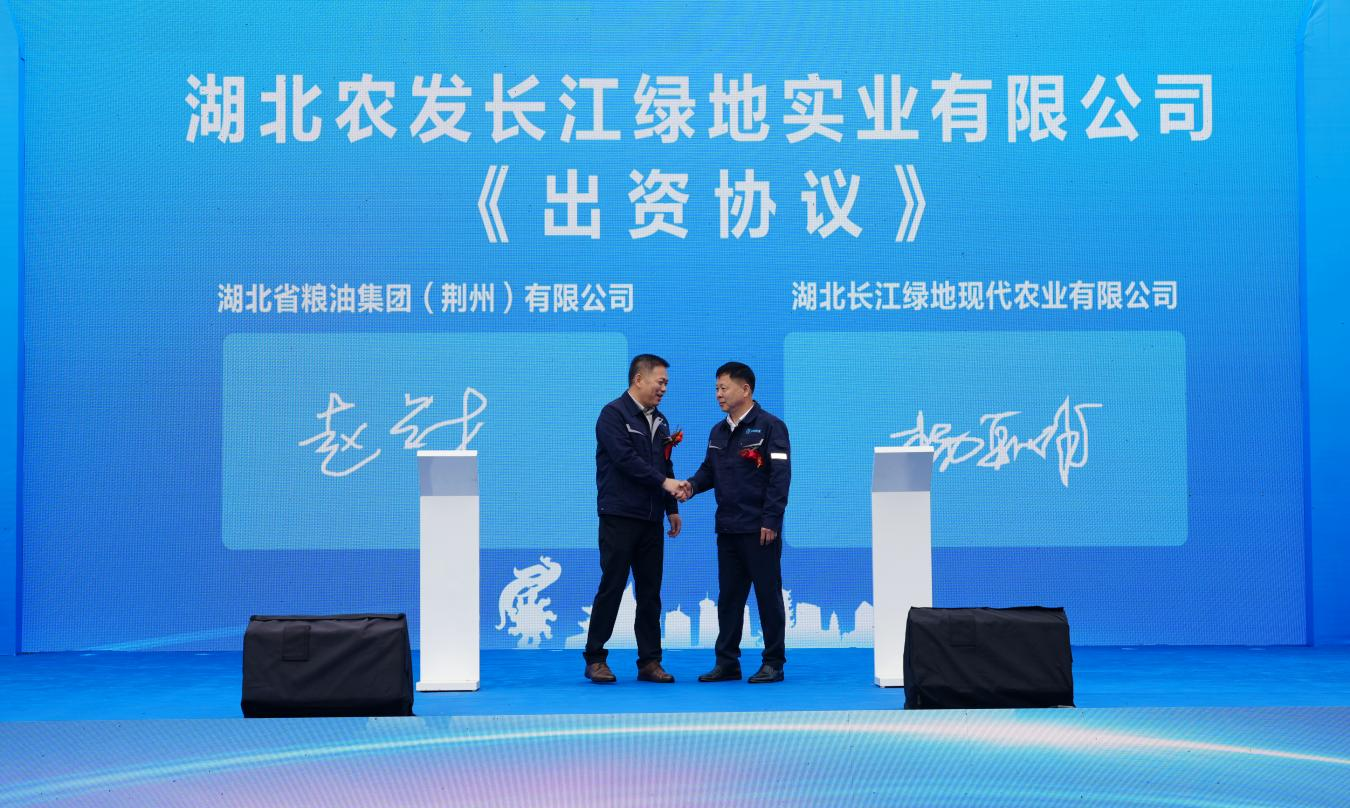 揭牌儀式上,湖北省糧油集團(tuán)荊州公司董事長(zhǎng)趙學(xué)才與湖北長(zhǎng)江綠地現(xiàn)代農(nóng)業(yè)有限公司董事長(zhǎng)楊朝雄簽訂《出資協(xié)議書》,并與10名戰(zhàn)略合作伙伴簽訂戰(zhàn)略合作協(xié)議。