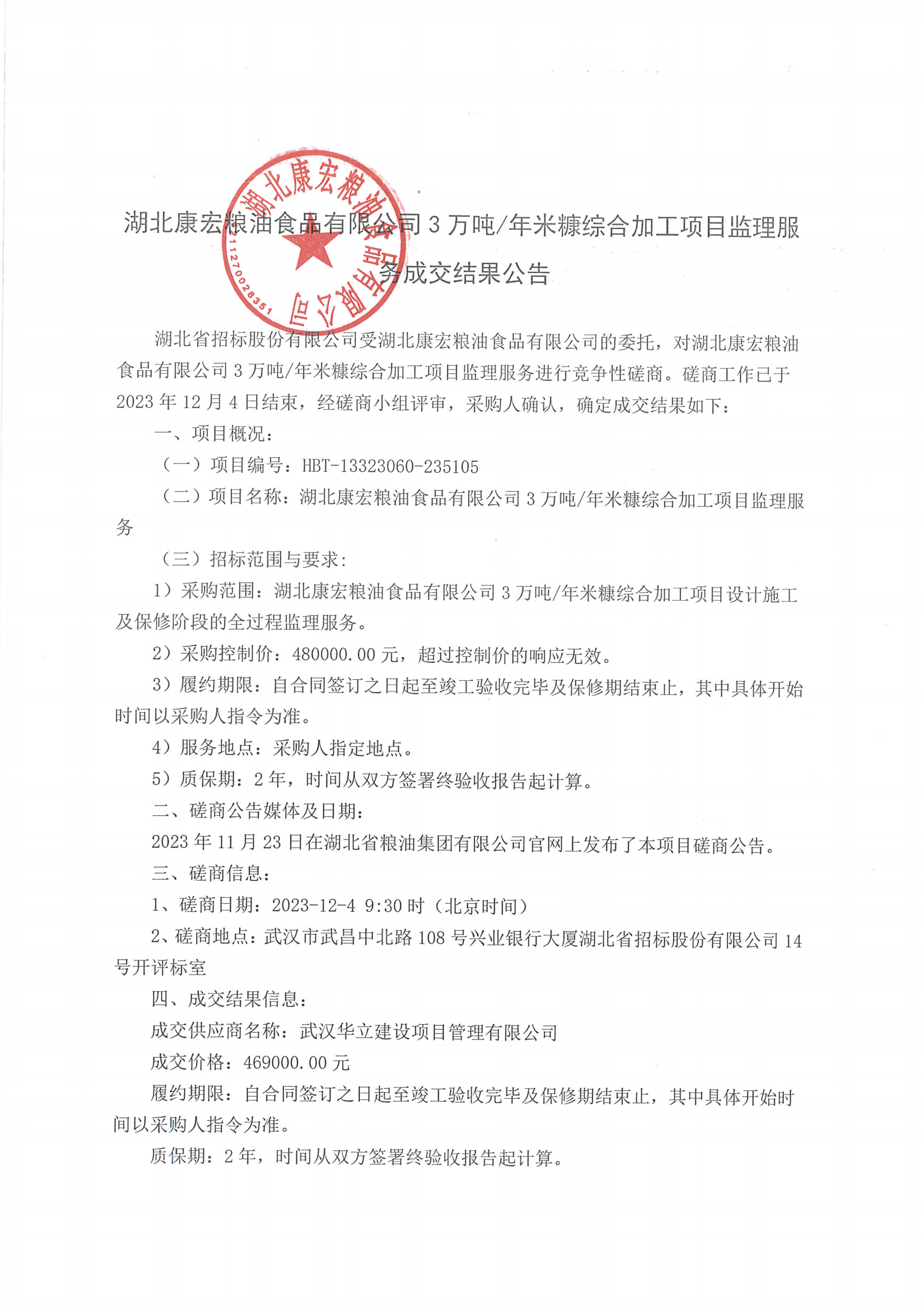 湖北康宏糧油食品有限公司3萬噸/年米糠綜合加工項目監(jiān)理服務成交結果公告