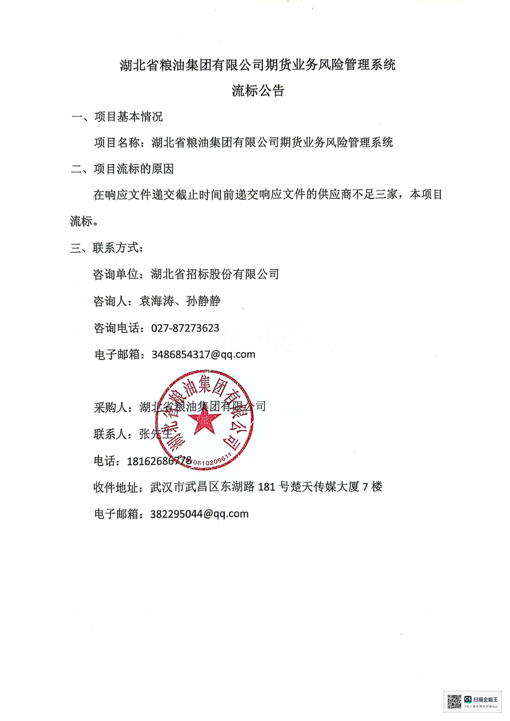 湖北省糧油集團(tuán)有限公司期貨業(yè)務(wù)風(fēng)險(xiǎn)管理系統(tǒng)流標(biāo)公告