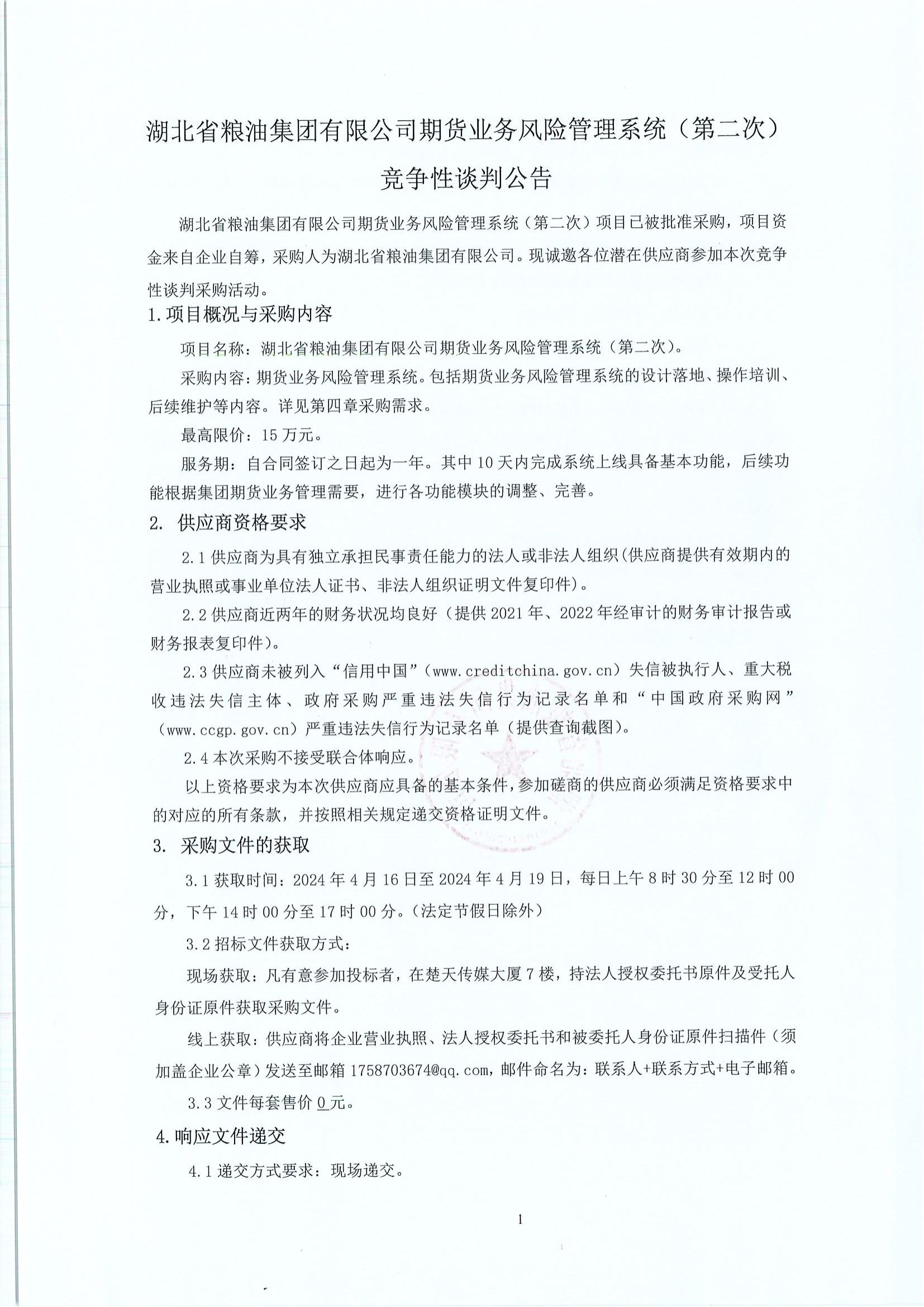 湖北省糧油集團有限公司期貨業(yè)務風險管理系統(tǒng)(第二次)競爭性談判公告