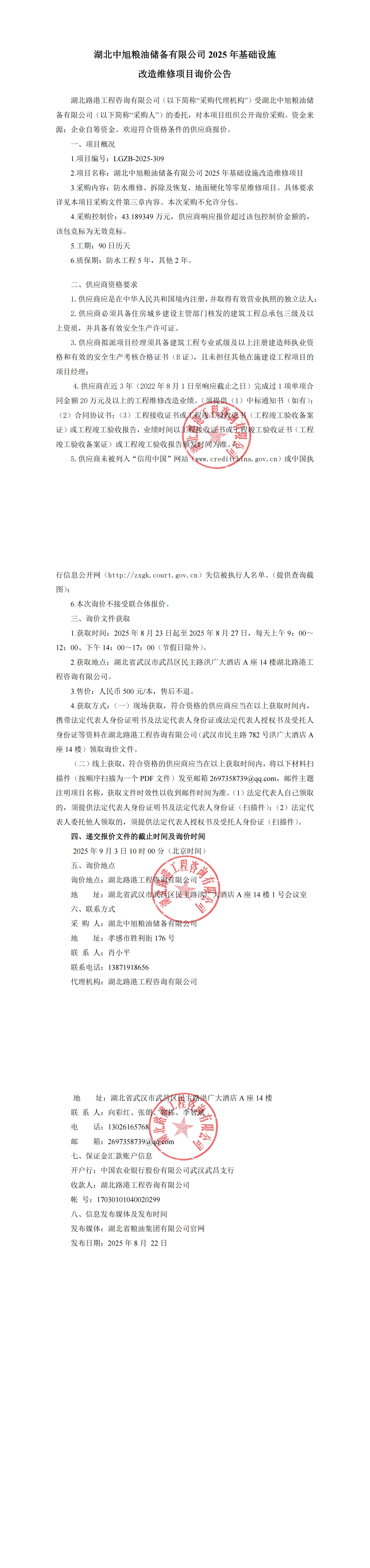 湖北中旭糧油儲備有限公司 2025 年基礎(chǔ)設(shè)施改造維修項目詢價公告