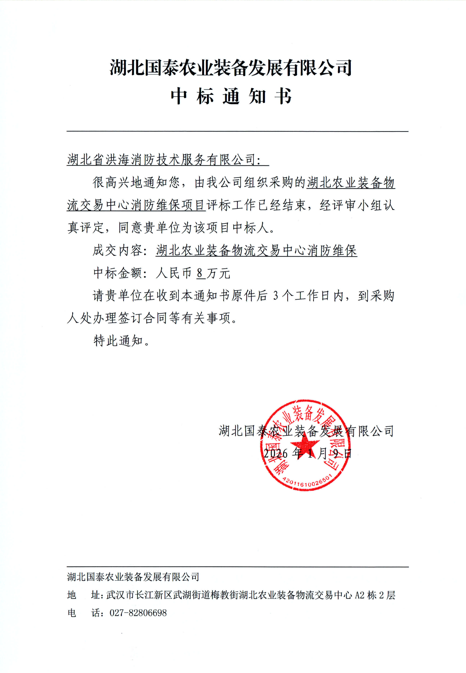 湖北國泰農(nóng)業(yè)裝備發(fā)展有限公司消防維保項(xiàng)目中標(biāo)通知書