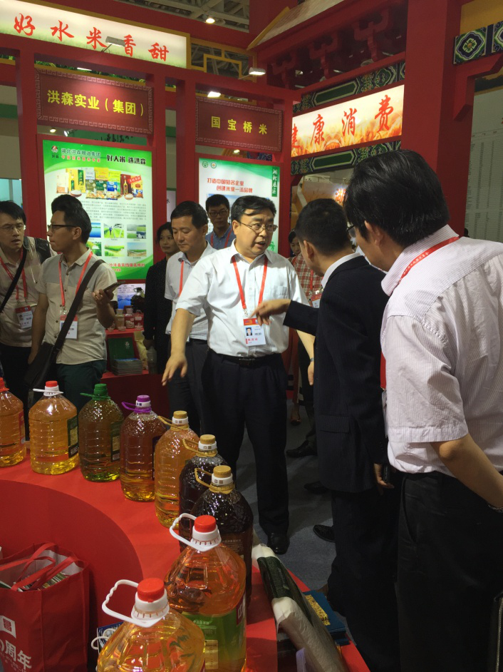圖為國家糧食局副局長盧景波(右三)在湖北糧食局副局長胡新明(右二)的陪同下蒞臨湖北省糧油集團展位指導(dǎo)工作