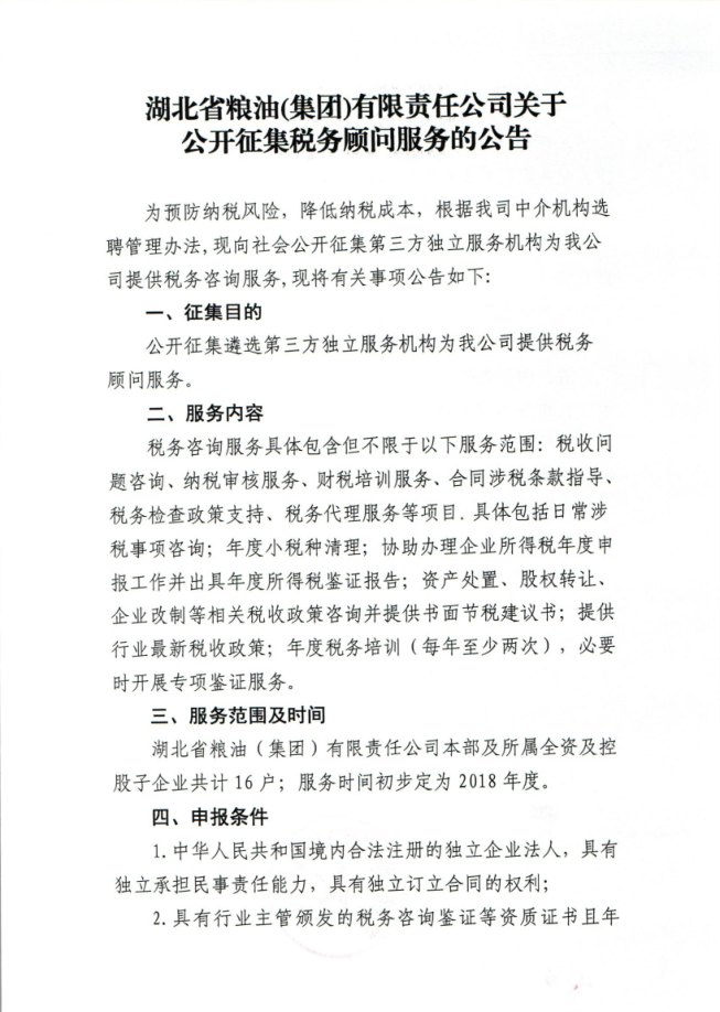 湖北省糧油(集團)有限責任公司關(guān)于公開征集稅務(wù)顧問服務(wù)的公告