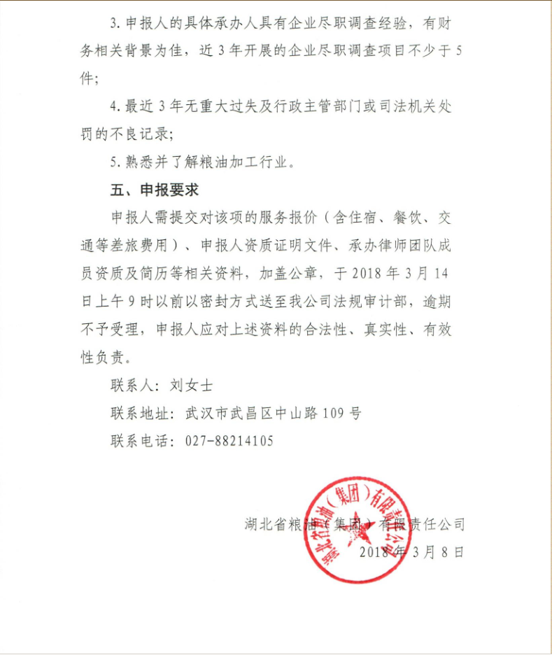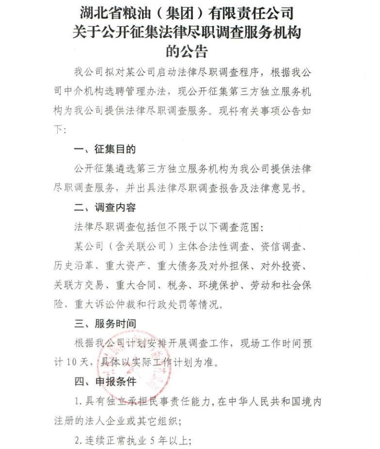 湖北省糧油(集團(tuán))有限責(zé)任公司關(guān)于公開征集法律盡職調(diào)查服務(wù)機(jī)構(gòu)的公告