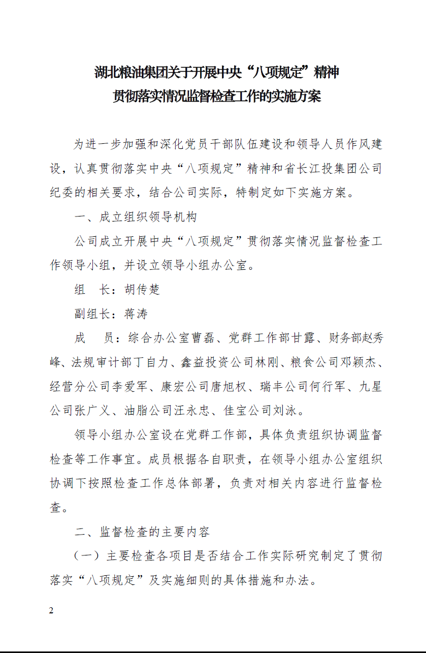 關(guān)于印發(fā) 《湖北糧油集團(tuán)關(guān)于開展中央 “八項(xiàng)規(guī)定”精神貫徹落實(shí)情況監(jiān)督檢查工作的實(shí)施方案》的通知