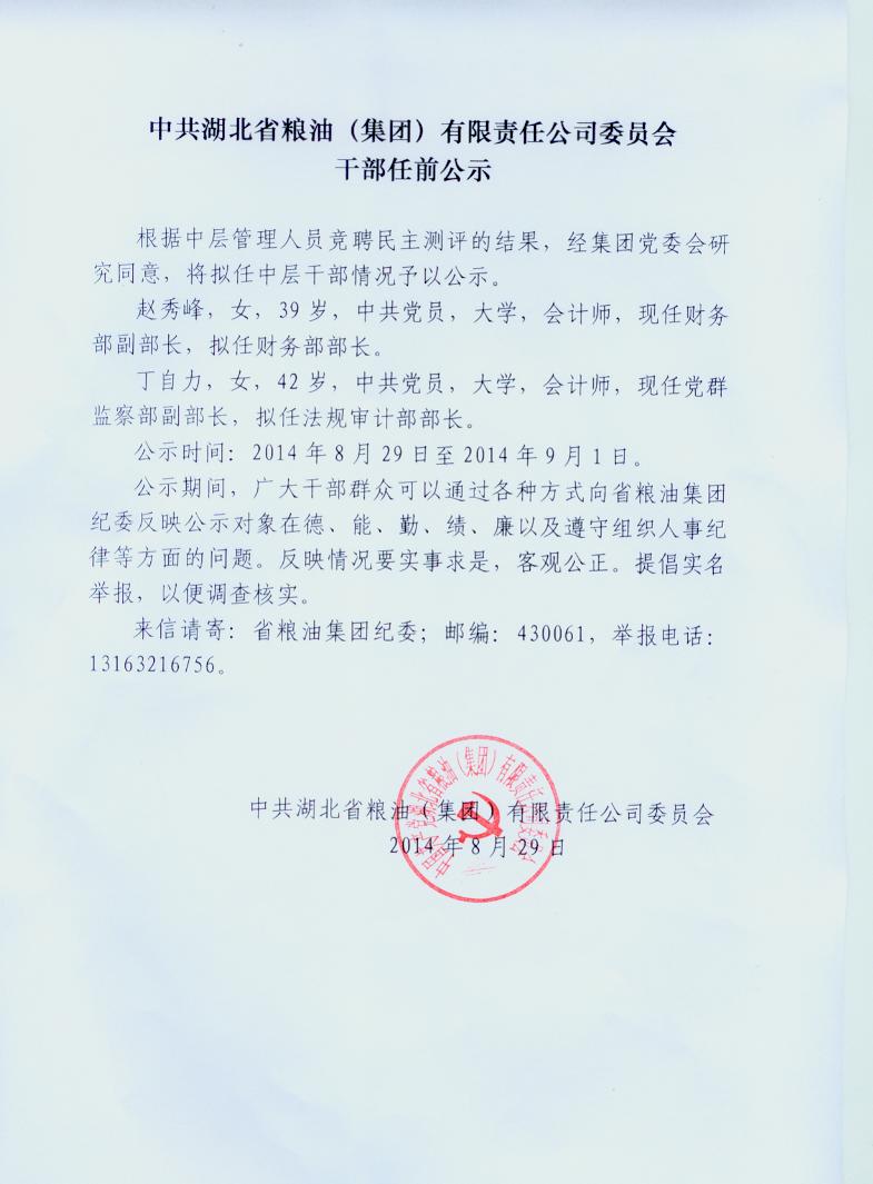 中共湖北省糧油(集團(tuán))有限責(zé)任公司委員會干部任前公示