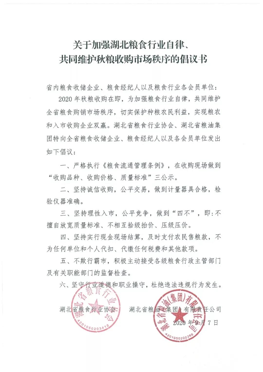 2020年秋糧收購在即,為加強(qiáng)糧食行業(yè)自律,共同維護(hù)全省糧食購銷市場秩序,切實(shí)保護(hù)種糧農(nóng)民利益,實(shí)現(xiàn)糧農(nóng)和入市收購企業(yè)雙贏。湖北省糧食行業(yè)協(xié)會(huì)、湖北省糧油集團(tuán)特向全省糧食收儲(chǔ)企業(yè)、糧食經(jīng)紀(jì)人以及各會(huì)員單位發(fā)出如下倡議:
