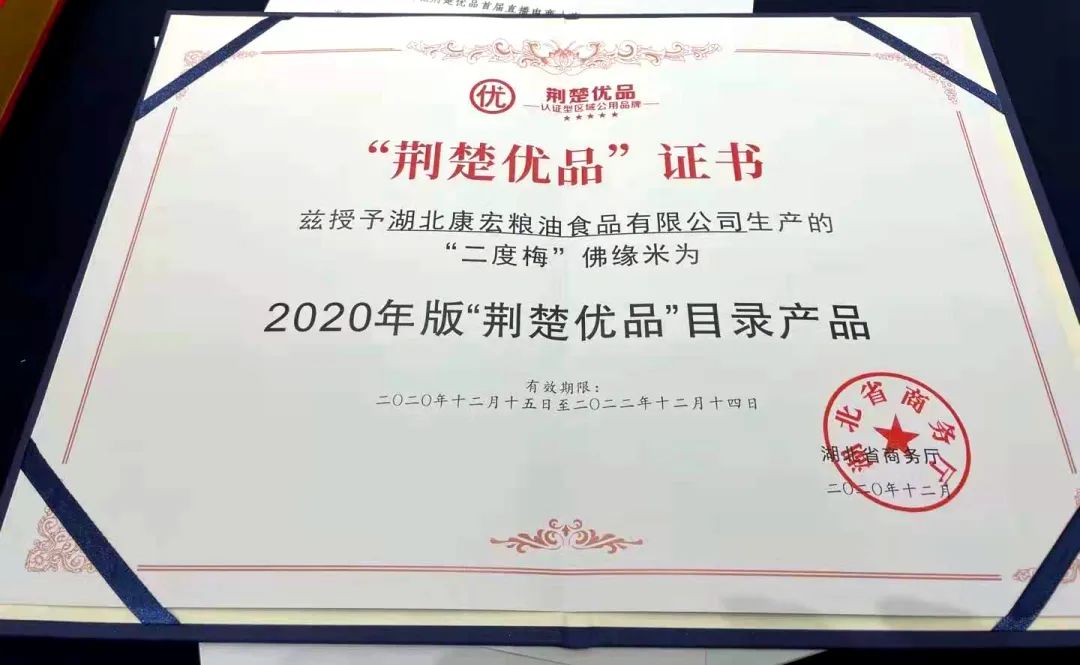 會議發(fā)布了2020年“荊楚優(yōu)品”目錄企業(yè)及區(qū)域公用品牌名單,并頒發(fā)了“荊楚優(yōu)品”榮譽獎杯。湖北省糧油集團旗下湖北康宏糧油食品有限公司生產(chǎn)的“二度梅”佛緣米入選2020年“荊楚優(yōu)品”目錄。