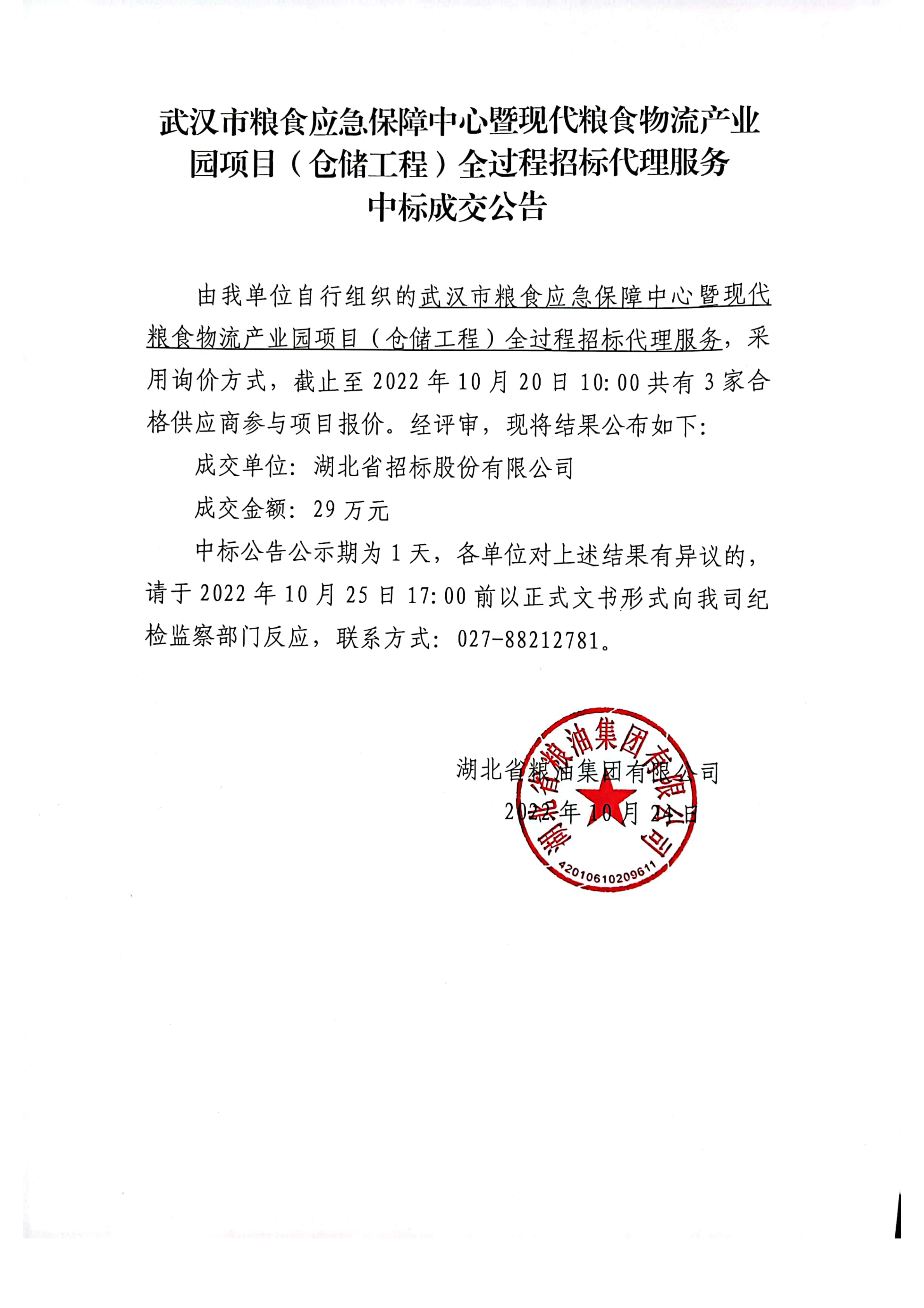 武漢市糧食應(yīng)急保障中心暨現(xiàn)代糧食物流產(chǎn)業(yè)園項目(倉儲工程)全過程招標(biāo)代理服務(wù)中標(biāo)成交公告
