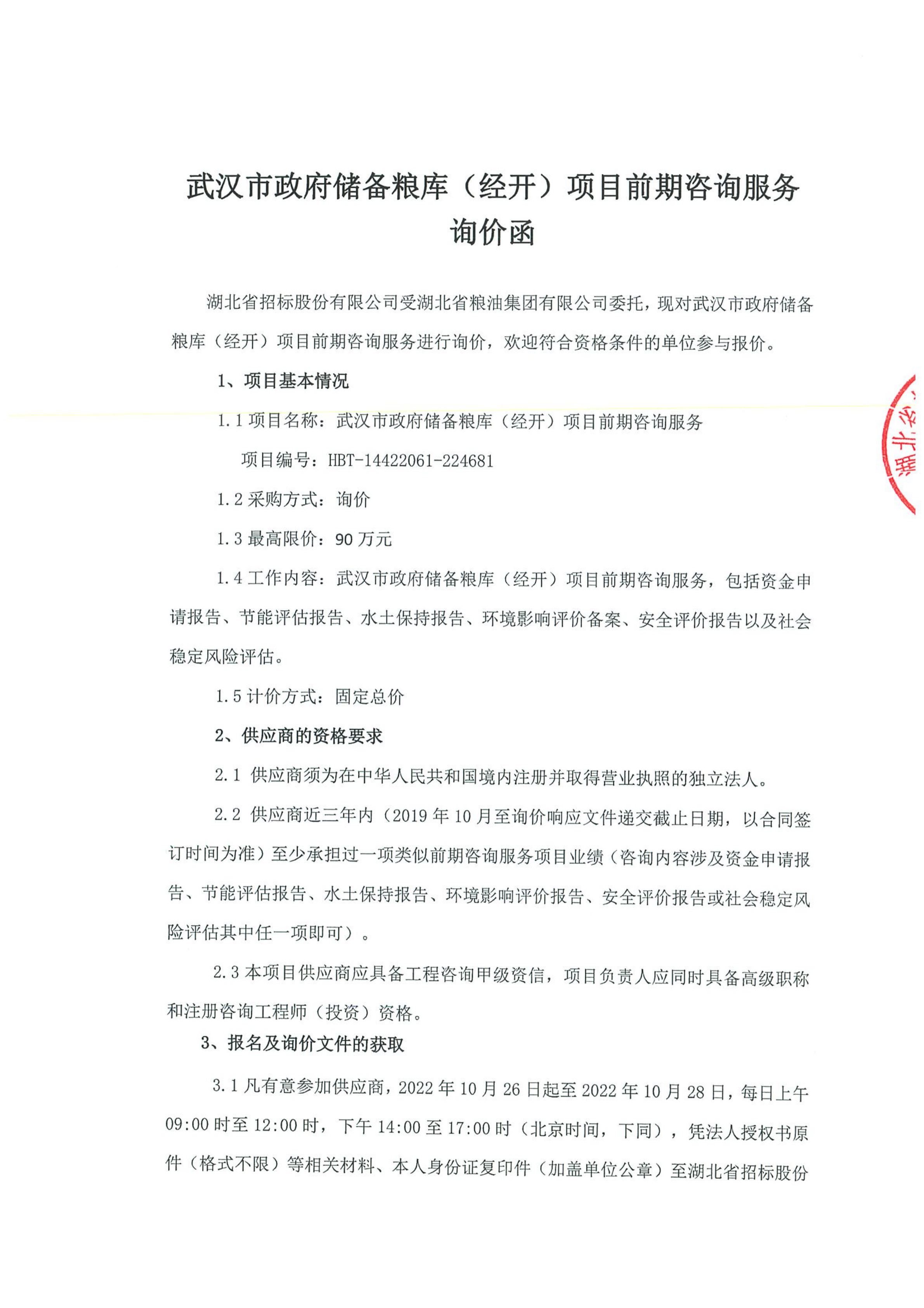武漢市政府儲(chǔ)備糧庫(經(jīng)開)項(xiàng)目前期咨詢服務(wù)詢價(jià)公告