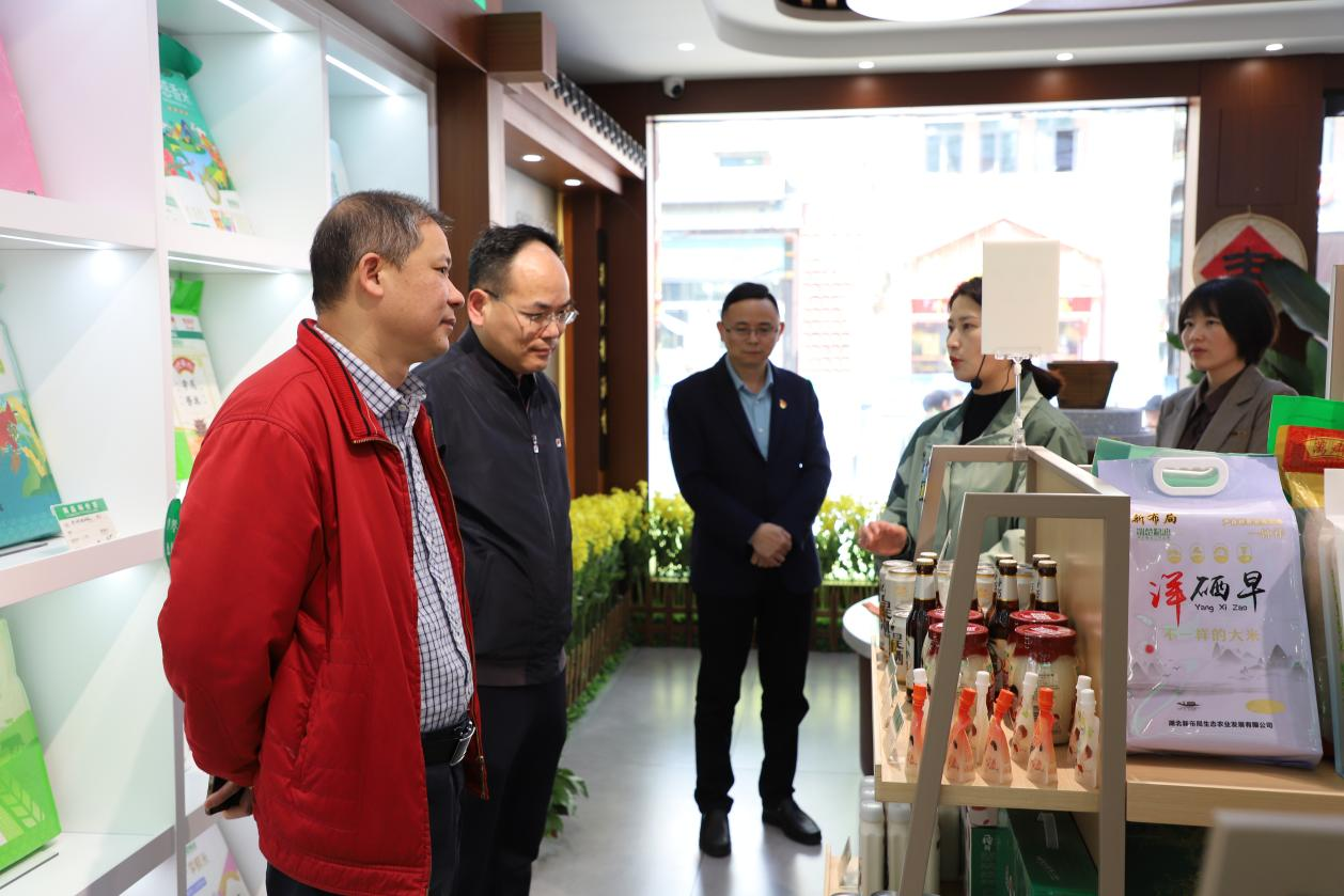 4月25日,省農(nóng)業(yè)農(nóng)村廳辦公室主任蔡俊松、市場與信息化處二級調(diào)研員余祥華一行蒞臨“荊楚糧油”省域公用品牌展銷中心調(diào)研,省糧食行業(yè)協(xié)會秘書長陳三才、副秘書長張玲等陪同調(diào)研。