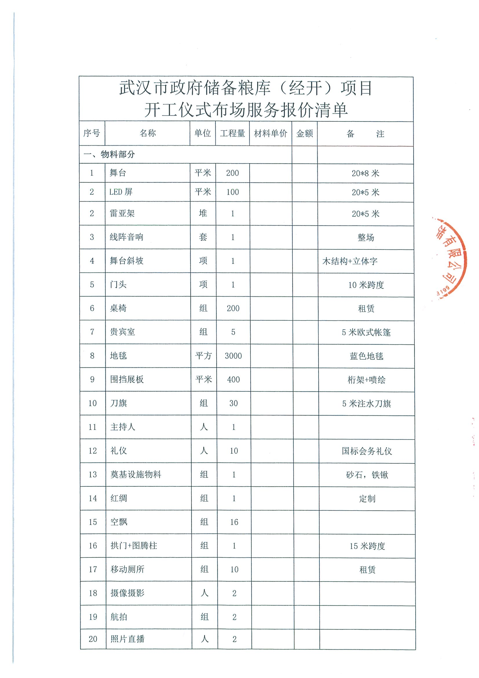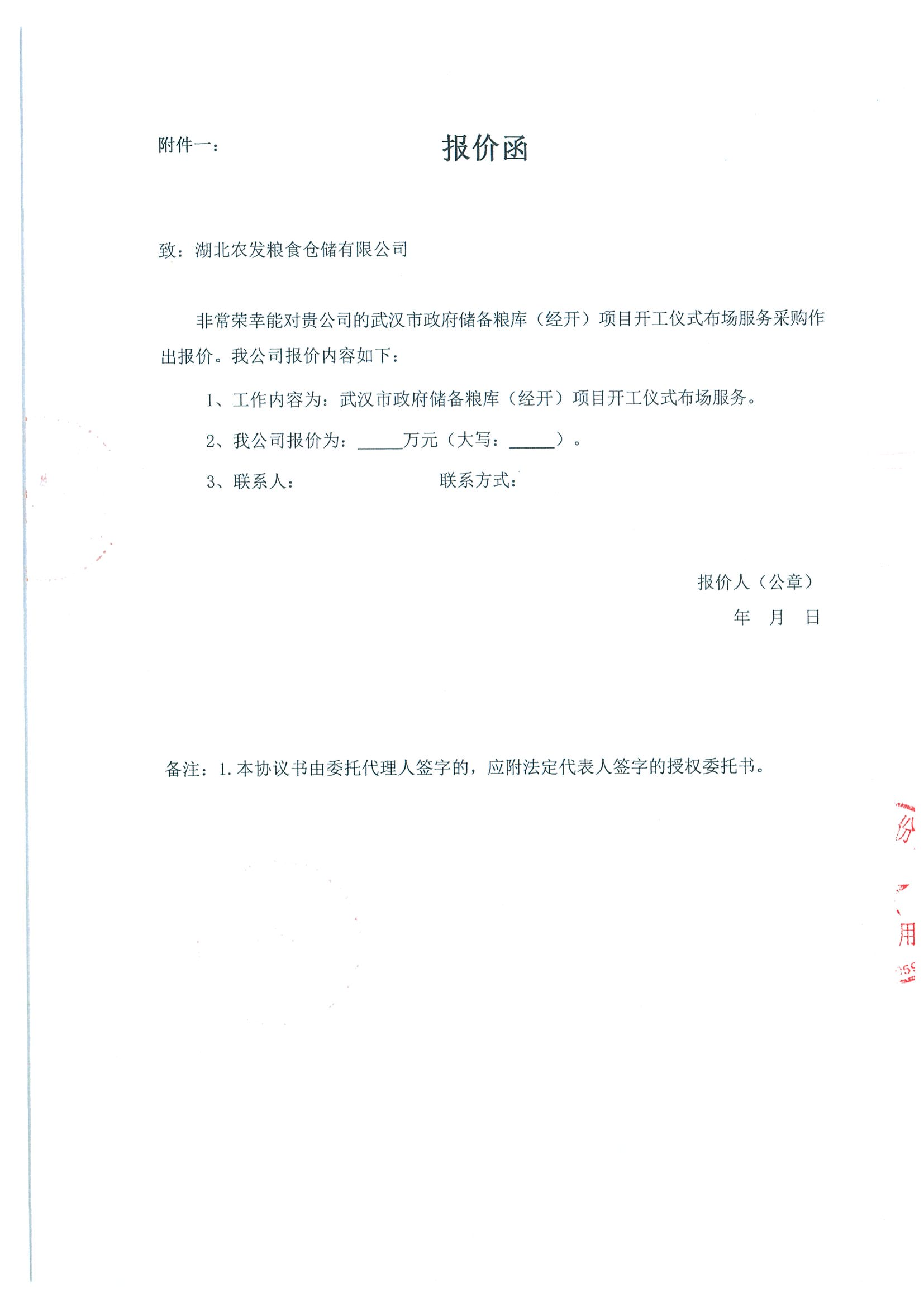 武漢市政府儲備糧庫(經(jīng)開)項目開工儀式布場服務(wù)采購詢價函