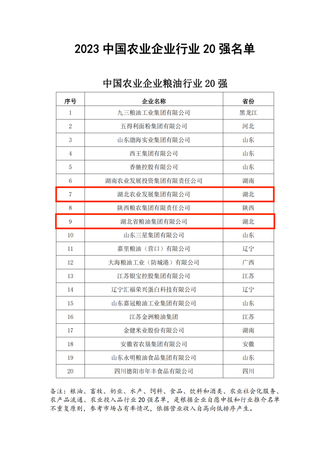 中國農(nóng)業(yè)企業(yè)500強評價活動由農(nóng)民日報社發(fā)起,已連續(xù)舉辦多年,是社會各界觀察農(nóng)業(yè)經(jīng)營主體發(fā)展和鄉(xiāng)村產(chǎn)業(yè)振興的重要窗口。今年,活動參照國際通行評價辦法,參考利潤和企業(yè)信譽等數(shù)據(jù),依據(jù)2022年農(nóng)業(yè)企業(yè)營業(yè)收入排序產(chǎn)生入選名單。除主榜單外,此次評選還下設糧油、畜牧、水產(chǎn)、食品等行業(yè)子榜單。其中,湖北農(nóng)業(yè)發(fā)展集團、湖北省糧油集團一并入圍“2023中國農(nóng)業(yè)企業(yè)糧油行業(yè)20強”榜單,分列第7和第9位,是湖北省僅有的2個上榜糧食企業(yè)。