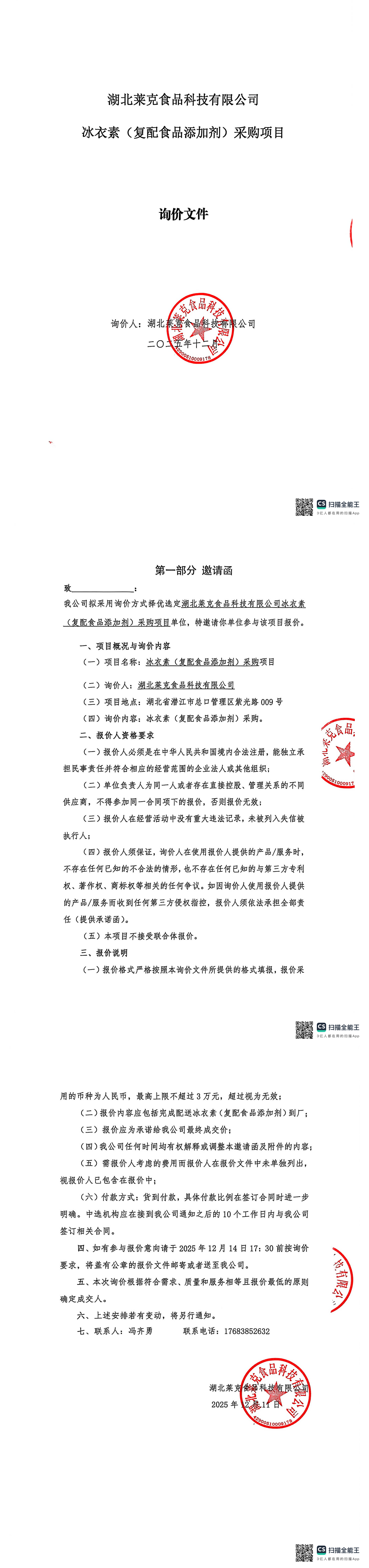 湖北萊克食品科技有限公司冰衣素(復(fù)配食品添加劑)采購項目詢價文件