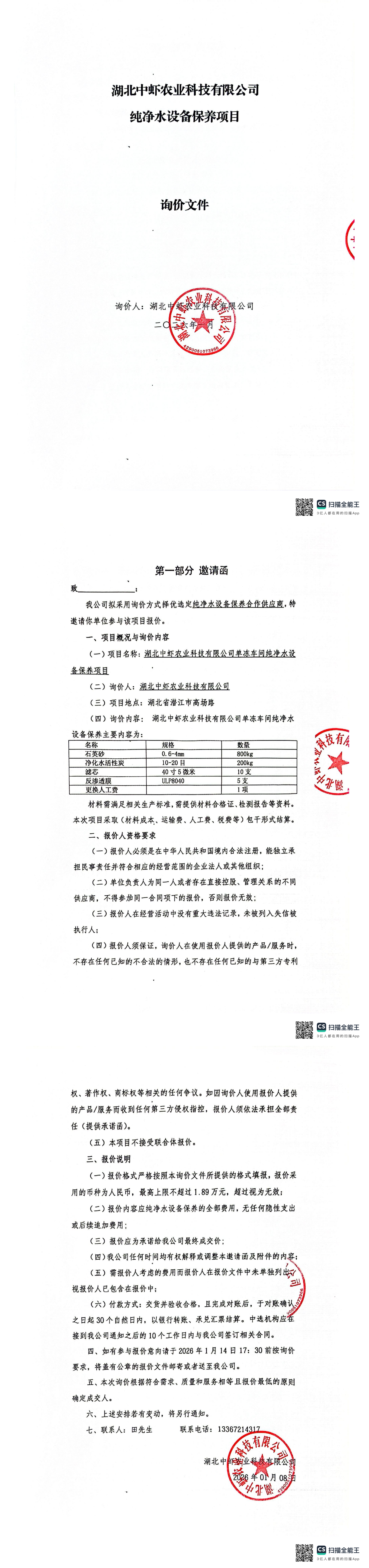 湖北中蝦農(nóng)業(yè)科技有限公司純凈水設(shè)備保養(yǎng)項(xiàng)目詢價(jià)公告