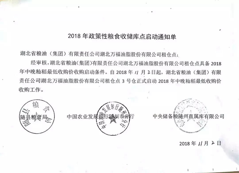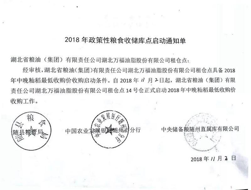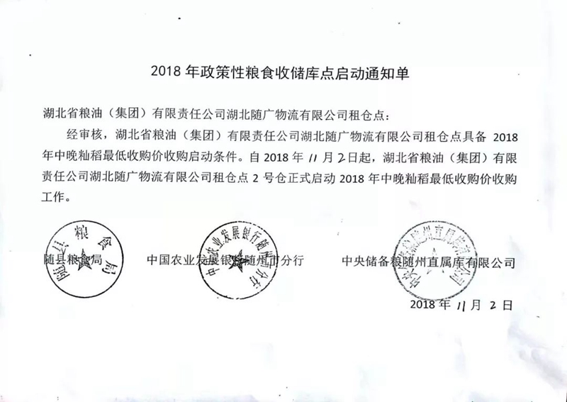 糧油集團(tuán)湖北萬(wàn)福油脂股份有限公司租倉(cāng)點(diǎn)3號(hào)倉(cāng)、14號(hào)倉(cāng),湖北隨廣物流有限公司租倉(cāng)點(diǎn)2號(hào)倉(cāng)正式啟動(dòng)2018年中晚秈稻最低收購(gòu)價(jià)收購(gòu)工作。