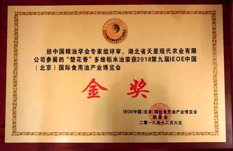 12月6日,第九屆IEOE中國(guó)(北京)國(guó)際食用油產(chǎn)業(yè)博覽會(huì)在北京舉行,省糧油集團(tuán)旗下湖北省天星現(xiàn)代農(nóng)業(yè)有限公司參展的“楚花香”多維稻米油榮獲金獎(jiǎng)。