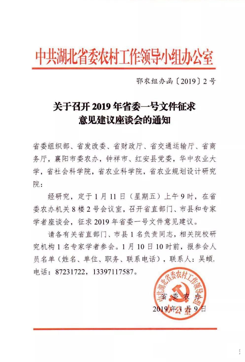 1月11日,湖北省委一號文件征求意見座談會在省委農(nóng)辦會議室舉行,湖北省糧油集團(tuán)下屬湖北省農(nóng)業(yè)規(guī)劃設(shè)計研究院受邀參會。