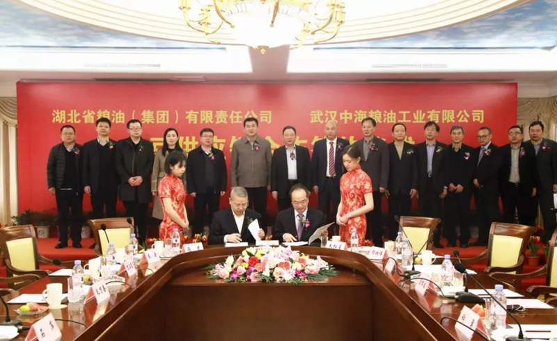 湖北糧油(集團(tuán))財(cái)務(wù)總監(jiān)龐虎與武漢中海糧油總經(jīng)理肖振曉簽約現(xiàn)場
