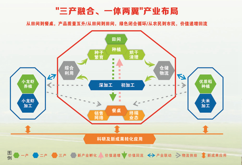 近年來(lái),康宏公司緊緊圍繞“三產(chǎn)融合、一體兩翼”的產(chǎn)業(yè)布局,不斷完善“從田間到餐桌”全產(chǎn)業(yè)鏈建設(shè)?!耙划a(chǎn)”方面,通過(guò)建基地、辦示范,扎實(shí)推進(jìn)土地流轉(zhuǎn)和蝦稻種養(yǎng),通過(guò)改造田間溝路渠,建設(shè)高標(biāo)準(zhǔn)農(nóng)田,推行訂單溢價(jià)收購(gòu),實(shí)現(xiàn)產(chǎn)業(yè)扶貧。目前公司已有優(yōu)質(zhì)稻種植示范基地6萬(wàn)畝,規(guī)劃蝦稻種養(yǎng)基地3萬(wàn)畝,實(shí)際已完成1.1萬(wàn)畝。“二產(chǎn)”方面,深耕“大米精深加工”和“水產(chǎn)品深加工”兩大板塊。目前,公司擁有糧食總倉(cāng)容26萬(wàn)噸,年稻谷加工能力30萬(wàn)噸,康宏生態(tài)示范園項(xiàng)目已建設(shè)完成小龍蝦加工生產(chǎn)線6條,年加工小龍蝦2萬(wàn)噸,年產(chǎn)值可達(dá)5億元?!叭a(chǎn)”方面,建設(shè)農(nóng)副產(chǎn)品、水產(chǎn)品交易市場(chǎng),形成糧食產(chǎn)后服務(wù)體系、線上線下綜合交易體系、倉(cāng)儲(chǔ)物流體系,同時(shí)結(jié)合農(nóng)業(yè)惠農(nóng)政策,發(fā)展農(nóng)業(yè)技術(shù)服務(wù)體系。三產(chǎn)相互融合,相互發(fā)展,促進(jìn)產(chǎn)業(yè)延伸,助力鄉(xiāng)村振興。