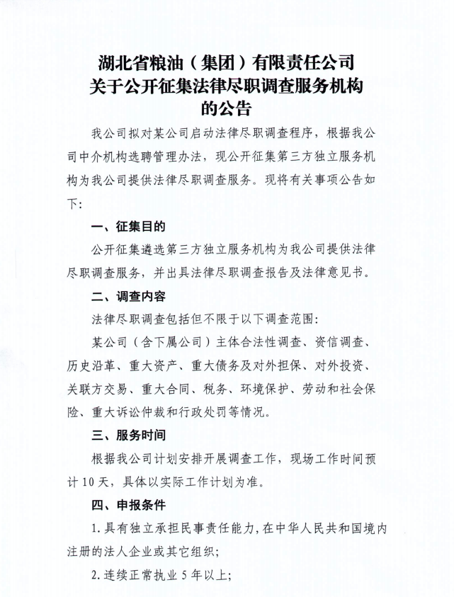 關(guān)于公開征集法律盡職調(diào)查服務(wù)機(jī)構(gòu)的公告