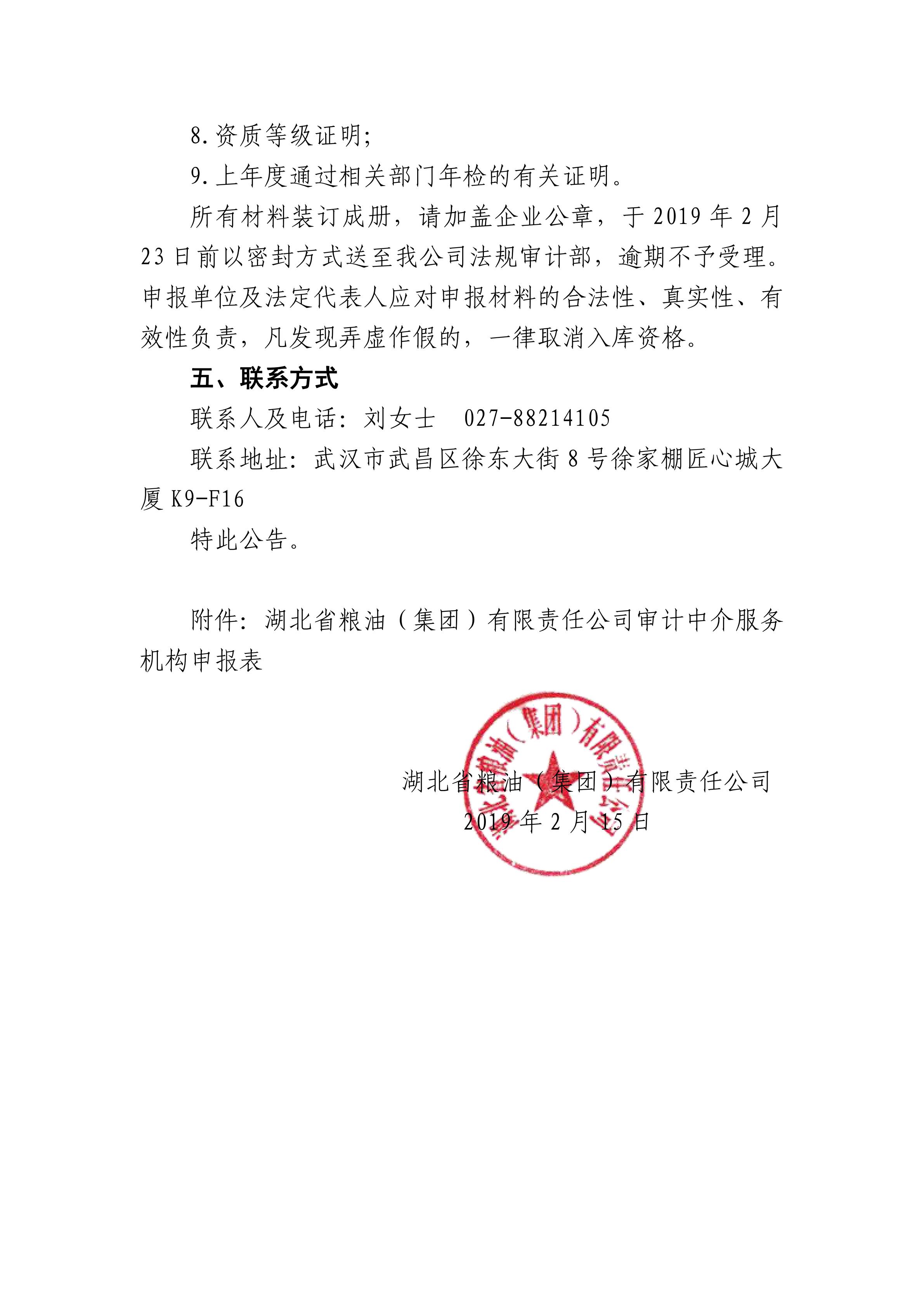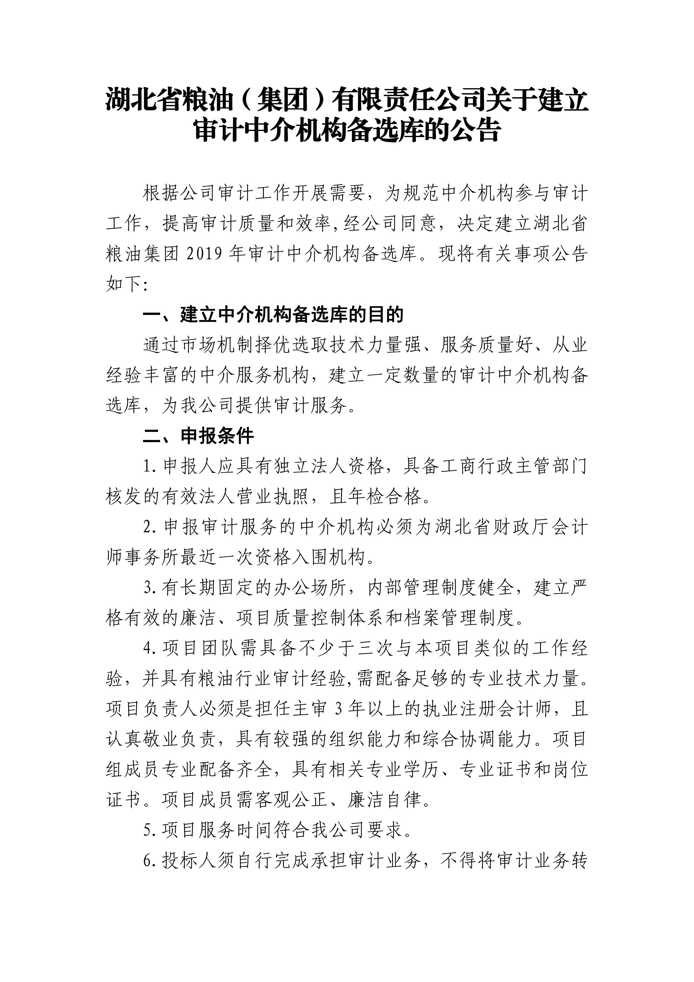 《湖北省糧油(集團)有限責任公司關于建立審計中介機構備選庫的公告》