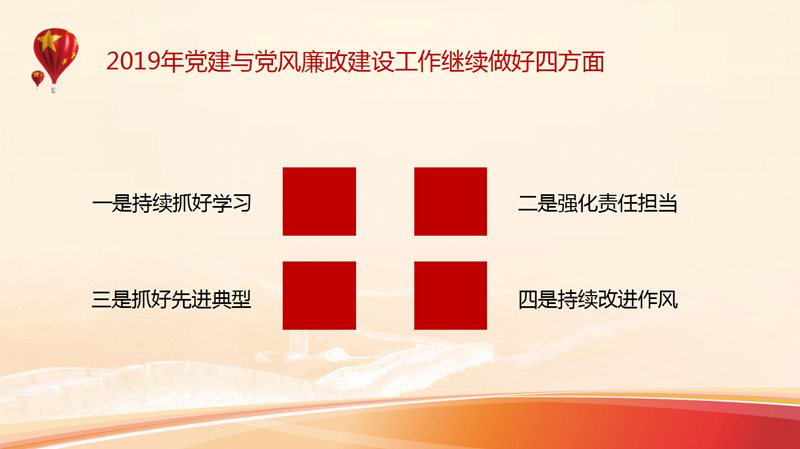 會(huì)議指出,在2019年黨建與黨風(fēng)廉政建設(shè)工作中要繼續(xù)做好四方面工作:一是持續(xù)抓好學(xué)習(xí)。進(jìn)一步把握學(xué)習(xí)方向,創(chuàng)新學(xué)習(xí)方式,堅(jiān)持圍繞主題學(xué)、結(jié)合實(shí)際學(xué)、研討交流學(xué);二是強(qiáng)化責(zé)任擔(dān)當(dāng)。從嚴(yán)夯實(shí)主體責(zé)任,從嚴(yán)督查指導(dǎo),從嚴(yán)考核評(píng)價(jià),確保全面從嚴(yán)治黨落實(shí)落地;三是抓好先進(jìn)典型。重點(diǎn)抓好示范基層黨組織建設(shè),挖掘先進(jìn)模范黨員,打造公司黨建工作的標(biāo)桿和亮點(diǎn);四是持續(xù)改進(jìn)作風(fēng)。進(jìn)一步扎牢制度籠子,探索權(quán)力制約機(jī)制,正確運(yùn)用好監(jiān)督執(zhí)紀(jì)“四種形態(tài)”,把好思想關(guān)、繃緊清廉弦,持續(xù)構(gòu)建風(fēng)清氣正的謀事創(chuàng)業(yè)環(huán)境。