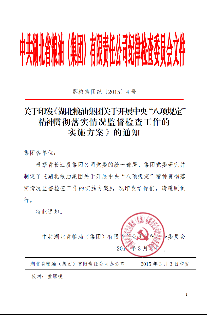 關(guān)于印發(fā) 《湖北糧油集團(tuán)關(guān)于開展中央 “八項(xiàng)規(guī)定”精神貫徹落實(shí)情況監(jiān)督檢查工作的實(shí)施方案》的通知