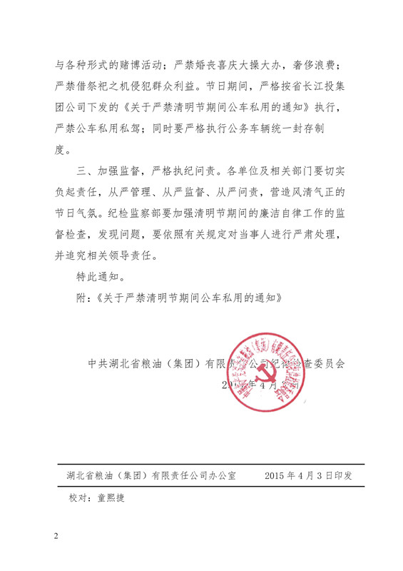 湖北省糧油集團關(guān)于進一步加強2015年清明節(jié)期間領(lǐng)導(dǎo)干部廉潔自律工作的通知